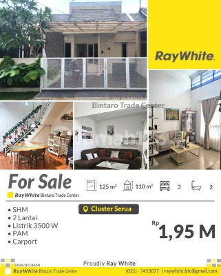 Harga Nego! Rumah Siap Huni 2 Lantai di Cluster Serua Ciputat Spesifikasi Luas tanah : 125 m² Luas bangunan : 110 m2 Kamar tidur 3 Kamar mandi 2 2 lantai Listrik 3500 Va SHM Dekat ke : - RS Buah Hati Ciputat - Pompa bensin Shell - Universitas pembangunan jaya - Stasiun Sudimara dan Jurangmangu - Pasar Ciputat - Bintaro Xchange - Sekolah SMP dan SMA Harga Rp1,95 M nego *(nyo/vna)