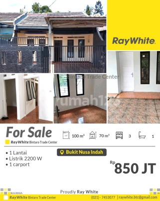 Paling Murah! Rumah Siap Huni di Bukit Nusa Indah - dekat ke Bintaro Spesifikasi Luas tanah : 100 m² Luas bangunan : 70 m2 Kamar tidur 3 Kamar mandi 2 1 lantai 1 carport SHM Dekat ke : - Bintaro Exchange - RS Buah Hati Ciputat - Pompa bensin Shell - Universitas pembangunan jaya - Stasiun Sudimara dan Jurangmangu - Sekolah SMP dan SMA - Kantor Polsek Bukit Nusa Indah Harga Rp850 juta nego *(ik/mya)