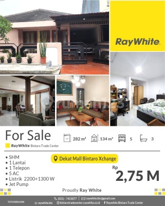 Rumah Siap Huni 1 Lantai di Sekitar Bintaro Area - Dekat Mall BXC Spesifikasi Luas tanah 282 m2 Luas bangunan 134 m2 1 lantai 5 KT 3 KM Listrik 2200+1300 Va jet pump SHM Akses Lokasi strategis di Graha Bintaro - Dekat dengan Pintu Tol Jkt Serpong - Dekat dengan stasiun kereta api Pondok Ranji, Jurang Mangu, Jombang - Dekat dengan mall Bintaro Plaza, Bintaro Xchange, Gramedia, McD, Pizza Hut, dengan Electronik city, dekat dengan Lotte mart, dekat dengan pasar modern. - Dekat dengan RS Premier Bintaro dan RS Mitra Keluarga Bintaro - Dekat Sekolah Internasional - Bebas Banjir Harga Rp2,75 M nego *(tti/an)