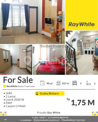 TERMURAH! Rumah Siap Huni di Lingkungan Nyaman Graha Bintaro Spesifikasi Luas tanah 90 m2 Luas bangunan 102 m2 Kamar tidur 3 Kamar mandi 3 2 lantai Air PAM carport 2 mobil SHM Akses Lokasi strategis di Graha Bintaro - Dekat dengan Pintu Tol Jkt Serpong - Dekat dengan stasiun kereta api Pondok Ranji, Jurang Mangu, Jombang - Dekat dengan mall Bintaro Plaza, Bintaro Xchange, Gramedia, McD, Pizza Hut, dengan Electronik city, dekat dengan Lotte mart, dekat dengan pasar modern. - Dekat dengan RS Premier Bintaro dan RS Mitra Keluarga Bintaro - Dekat Sekolah Internasional Harga Rp1,75 M nego *(ria)