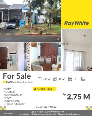 For Sale! Rumah 1 lantai Luas dengan Harga Terjangkau di Graha Raya - Nego! Spesifikasi Luas tanah 190 m2 Luas bangunan 98 m2 Kamar tidur 2 Kamar mandi 1 1 lantai Listrik 2200 Va PAM carport taman tempat jemur taman belakang, pagar besi, teralis SHM Lokasi stretegis di Graha Raya ○ Cluster keamanan 24jam ○ Jalan 2 mobil ○ Dekat Pasar Segar Graha Raya ○ Akses sangat mudah. ○ Dekat komplek pertokoan Beryl, Melia Walk, Transmart Graha Raya, Pasar Modern Graha Raya. ○ Akses Tol Parigi, Tol Alam Sutera, Tol Bintaro Harga Rp2,75 M nego *(vna/nyo)