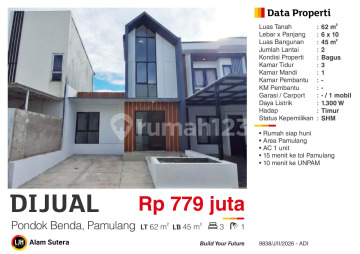 Kesempatan terbatas buat Anda dapatkan rumah strategis dengan return investasi tinggi di Pamulang, Tangerang Selatan. Rumah ini menawarkan lokasi yang strategis serta memiliki nilai tepat yang siap untuk segera Anda miliki, utamanya bagi Anda yang mencari hunian di lokasi yang terjangkau. Kondisi properti ini bagus dan memiliki desain modern yang menambah daya tarik dan estetika properti ini. Rumah ini berada di wilayah strategis. Detail Properti ini adalah: - Kamar Tidur: 3 - Kamar Mandi: 1 - Sertifikat: SHM - Sertifikat Hak Milik - Daya Listrik: 1300 watt - Arah Bangunan: Menghadap Timur - Kondisi Perabotan: Semi Furnished Tersedia berbagai fasilitas lengkap, seperti: - Wastafel. - Keamanan 24 jam. - Taman. Tidak hanya itu, namun properti ini juga memiliki keunggulan sebagai berikut: - Bisa KPR. - Siap Huni. - Bebas Banjir. - Dekat Pusat Perbelanjaan. - Dekat Fasilitas Kesehatan. - Lokasi dipusat kota. - City View. - Properti Bisa Nego. - Lokasi Strategis. Lokasi Strategis terletak di Pamulang, properti ini memudahkan akses Anda ke fasilitas-fasilitas utama dan unggulan. Harga yang sangat kompetitif yaitu, Rp. 779.000.xxx, rumah ini siap menjadi milik Anda! Nikmati segala kemudahan dan berbagai keunggulan menarik saat properti premium ini milik Anda.