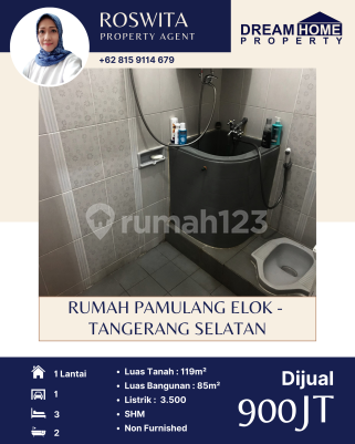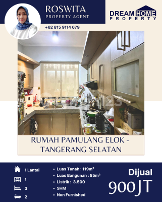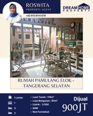 DIJUAL Rumah - Pamulang Elok, Tangerang Selatan Luas Tanah : 119 m2 (SHM) Luas Bangunan : 85 m2 Kamar Tidur : 3 Kamar Mandi : 2 Listrik : 3500 watt Jumlah lantai : 1 Carport utk brp mobil : 1 mobil More info : Roswita +62815911xxxx Dream Home Property