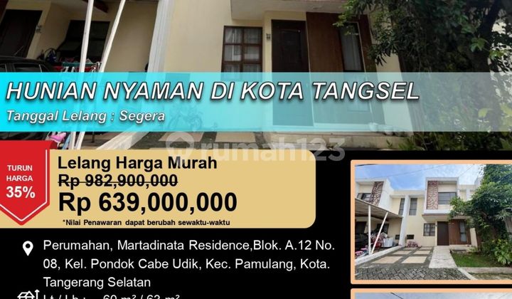 Kesempatan terbatas buat Anda dapatkan rumah nyaman dengan return investasi tinggi di Pamulang, Tangerang Selatan. Rumah ini menawarkan lokasi yang strategis serta memiliki nilai tepat yang siap untuk segera Anda miliki, utamanya bagi Anda yang mencari hunian di lokasi yang dekat dengan fasilitas umum. Kondisi properti ini bagus dan memiliki desain indah yang menambah daya tarik dan estetika properti ini. Rumah ini berada di area yang mudah dijangkau. Detail Properti ini adalah: - Kamar Tidur: 2 - Kamar Mandi: 1 - Sertifikat: SHM - Sertifikat Hak Milik - Arah Bangunan: Menghadap Utara - Kondisi Perabotan: Unfurnished Tersedia berbagai fasilitas lengkap, seperti: - Akses Parkir. Tidak hanya itu, namun properti ini juga memiliki keunggulan sebagai berikut: - Dekat Akses Tol. - Dekat Fasilitas Kesehatan. - Dekat Pusat Perbelanjaan. - Aset Lelang. Lokasi Strategis terletak di Pamulang, properti ini memudahkan akses Anda ke fasilitas-fasilitas utama dan unggulan. Harga yang sangat kompetitif yaitu, Rp. 639.000.xxx, rumah ini siap menjadi milik Anda! Nikmati segala kemudahan dan berbagai keunggulan menarik saat properti eksklusif ini milik Anda.
