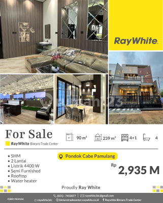 Rumah Idaman dengan Rooftop untuk Keluarga Anda! Siap huni semi furnished Spesifikasi -Luas Tanah 90 m2 -Luas Bangunan 239 m2 -Kamar Tidur 4+1 -Kamar Mandi 4 -2 Lantai -Listrik 4400 W -Rooftop -Semi Furnished -Water Heater Akses terdekat: +Pintu tol Pamulang +Kampus UNPAM, UIN, dan Universitas Terbuka +Tip Top Ciputat +RSU Tangsel +Terminal Pondok Cabe +Pool Primajasa Ciputat +Samsat Cinere +RS Hermina Ciputat Harga: 2,395 M (nego sampai deal) *Feb/Wan