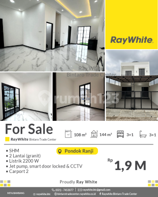 Spesifikasi: Luas tanah 108 m2 Luas bangunan 144 m2 Kamar tidur 3+1 Kamar mandi 3+1 Listrik 2200 Va 2 lantai (granit) Jet Pump Carport 2 Smart door lock Atap baja ringan CCTV Kompor Surat : SHM Berada di perumahan Bintaro yang lokasinya strategis : +Dekat dengan Stasiun Pondok Ranji +Dekat dengan Pintu tol Bintaro Viaduct +Dekat dengan Pintu tol Jkt-Serpong +Dekat dengan Mall Bintaro Plaza +Dengan dengan Mc Donals, KFC +Dekat dengan Pasar +Dekat dengan banyak restoran dan coffe shop di Bintaro Harga: 1,9 M (nego) *(Bam)