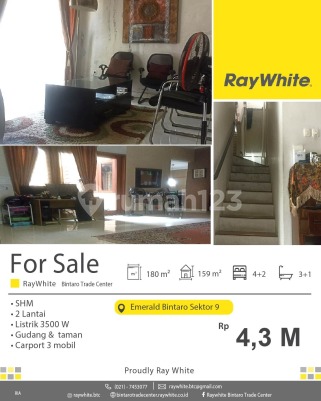 Spesifikasi *Luas tanah 180 m2 *Luas bangunan 159 m2 *Kamar tidur 4+2 *Kamar mandi 3+1 *2 Lantai *Gudang *Listrik 3500 Watt *Sertifikat : SHM Akses strategis mudah kemana saja, keamanan 24 jam: +Dekat pintu toll Jkt-Serpong +Dekat stasiun Sudimara, Jurang Mangu, Pondok Ranji +Dekat pusat perbelanjaan Pasar Modern Bintaro +Dekat Mall Bintaro X change, Bintaro Plaza, Lotte Mall +Dekat Rumah Sakit Pondok Indah Bintaro, Premier Bintaro Mitra Keluarga +Dijamin Bebas Banjir +Keamanan 24 jam Harga 4,3 M