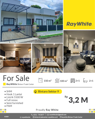 Spesifikasi: *Luas tanah 150 m2 *Luas bangunan 100 m2 *Kamar tidur 2+1 *Kamar mandi 2+1 *1 Lantai *Listrik 5500 Watt *PAM *Full Furnished *Sertifikat : SHM Akses strategis mudah kemana saja, keamanan 24 jam: +Dekat pintu toll Jkt-Serpong +Dekat stasiun Sudimara, Jurang Mangu, Pondok Ranji +Dekat pusat perbelanjaan Pasar Modern Bintaro +Dekat Mall Bintaro X change, Bintaro Plaza, Lotte Mall +Dekat Rumah Sakit Pondok Indah Bintaro, Premier Bintaro Mitra Keluarga +Dijamin Bebas Banjir +Keamanan 24 jam Harga 3,2 M (nego) *(Bob)
