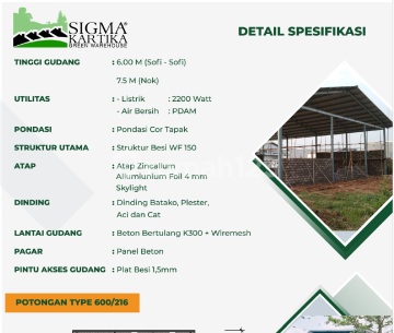 Gudang di perbatasan Serpong-bogor , Tangerang Selatan. Tinggi Gudang 6 m ( Sofi Sofi) 7,5 m Nok pondasi Cor Tapak Struktur utama besi WF 150 dinding batako plaster aci dan cat Atap Zincallum alumunium foil 4 mm skylight Lanta Gudang : beton bertulang K3000 + wiremesh Pintu Akses Plat Besi 1,5 mm ini adalah Green Warehouse di wilayah yang nyaman. Dengan rinciannya adalah sebagai berikut: - Kamar Mandi: 1 - Sertifikat: SHM - Sertifikat Hak Milik - Kondisi Perabotan: Semi Furnished - Air PDAM Lokasi gudang berikut strategis, hanya selangkah menuju berbagai fasilitas utama dan menarik. 20 menit ke pintu akses toll Dengan Rp. 4.200.000.xxx, anda dapat langsung dapatkan gudang istimewa JK
