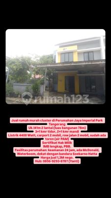 Jual rumah murah cluster di Perumahan Jaya Imperial Park Tangerang Uk.141m 2 lantai (luas bangunan 78m) 3+1 kmr tidur, 2+1 kmr mandi Listrik 4400 Watt, carport 2 mobil, row jalan 2 mobil, sudah ada toren (air PAM) Sertifikat Hak Milik IMB lengkap, PBB. Fasilitas perumahan: keamanan 24 jam, ada McDonald, Waterboom, dekat dengan bandara Soekarno Hatta Harga jual 1,3M nego. Hub: 0856xxxxxxxxYanti)