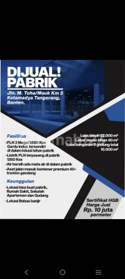 *DIJUAL Tanah dan Pabrik Baru di M.Toha / Mauk, Tangerang* Luas tanah : 22.000m Luas Bangunan 9.265 m2 ( 6 bangunan ) Ketinggian bangunan 12 meter. Gedung 1A mempunyai luas 710 meter persegi ( Dinding bata) Gedung 1 luasnya 2.130 meter persegi ( Dinding bata ) Gedung 2 luasnya 1587 meter persegi ( Persegi panjang ) Gedung 3 luasnya 1.516 meter persegi ( Persegi panjang ) Gedung 4 mempunyai luas 2.150 meter persegi ( persegi panjang ) Gedung 5 mempunyai luas 1.172 meter persegi ( Persegi panjang ) Tinggi bangunan 12m Tinggi tiang 9 m PLN 3 Mega, Gardu Induk Pabrik (1.260kva terpasang) Membawa mata air sendiri ( bersih ) Jalur air ada di sana. Ada trafo 1600kva Memiliki kapasitor 1600kva Akses Kontainer 40feet Ada kantor, kafetaria, keamanan, dll. Izin industri *Harga : 10 Juta / Meter ( Nego )* FR3D