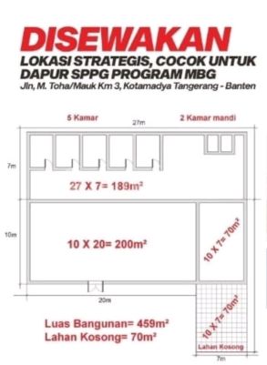 Disewakan Gudang Luas Bangunan 459 m Lahan kosong 70 m Ruang kerja 6 unit x 27 x 7 = 189 m Kamar Mandi 2 unit Ruang kerja 1 unit x 10 x 20 = 200 m Ruang kerja 1 unit x 10 x 7 = 70 m Lahan Kosong 1 unit x 10 x 7 = 70 m Sewa minimal 3 tahun Harga sewa Rp 380 juta