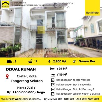 Rumah 2 lantai berlokasi di Ciater Tangerang Selatan,berada di dalam komplek hunian cluster yang asri dan nyaman,Posisi rumah HOOK,Row jalan paving yg cukup lebar.lokasinya sangat strategis terletak di: - dekat Kantor Walikota -dekat dengan stasiun Rawabuntu -dekat dengan pintu Tol Serpong 2 -Dekat dengan sekolah negeri dan swasta Luas tanah 99m2,luas bangunan 119m2