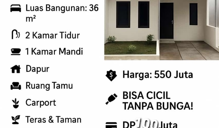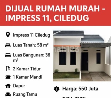 DIJUAL RUMAH MURAH - IMPRESS 11, CILEDUG Impress 11 Ciledug Luas Tanah: 58 m² Luas Bangunan: 36 m² 2 Kamar Tidur 1 Kamar Mandi Dapur Ruang Tamu Carport Teras & Taman Sertifikat SHM Harga: 550 Juta