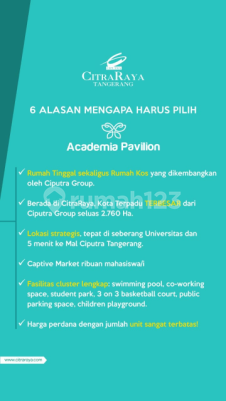 Lokasi sangat strategis terletak di Boulevard Utama Citra Raya ROW 40m dan berada di kampus 2 Universitas Esa Unggul yang sedang dibangun, harga mulai 1 M an includ PPN<br>Untuk info lebih jelas bisa hubungi di 089563xxxxxxx dengan Riska