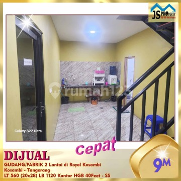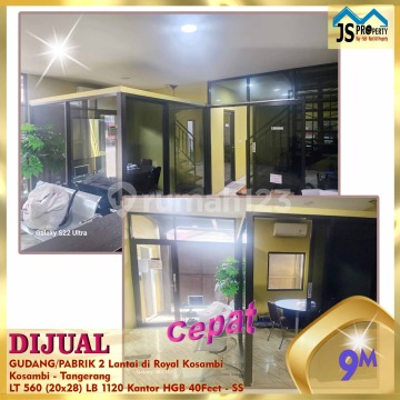 DIJUAL CEPAT GUDANG/PABRIK 2 Lantai di Royal Kosambi Kosambi - Tangerang Lokasi strategis Dekat pintu tol PIK2 Ceilling 8 meter Kapasitas lantai 2,5 ton per m2 Kontainer 40 feet Row jalan 39 meter Keamanan 24 jam One Gate System Luas Tanah 560 m² Dimensi 20 x 28 m² Luas Bangunan 1.120 m² 2 Lantai Kantor Listrik 11.000 Watt Air PAM Sertifikat SHGB Hal yang Menarik : Bebas Banjir Harga 9 M Nego