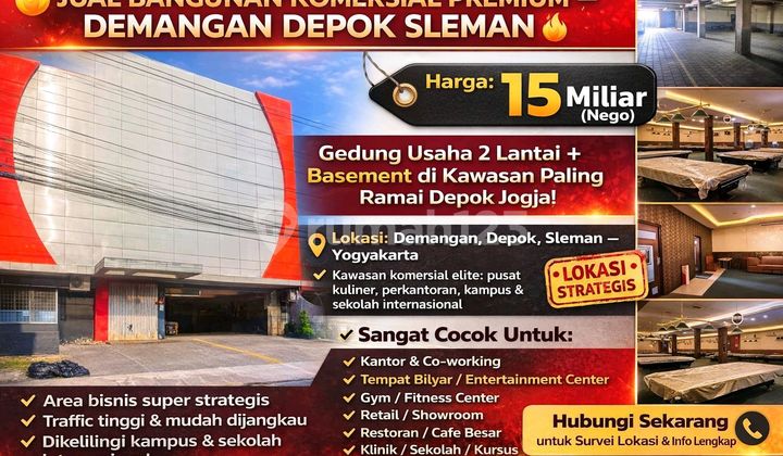 Jual bangunan komersial premium di kawasan Demangan, Depok, Sleman, Yogyakarta. Properti ini memiliki lokasi sangat strategis di pusat bisnis dan kuliner Depok, dikelilingi kampus ternama, sekolah internasional, serta area perkantoran. Spesifikasi: Luas Tanah: 500 m² Luas Bangunan: ±900 m² Bangunan 2 lantai Basement / parkiran ±300 m² Akses mudah, area ramai, cocok branding usaha Bangunan sangat cocok untuk berbagai jenis usaha seperti kantor, tempat bilyar, gym, fitness center, retail, restoran, cafe, klinik, sekolah, dan co-working space. Harga: 15 Miliar (nego) Investasi sangat potensial di salah satu kawasan komersial paling berkembang di Sleman Yogyakarta.