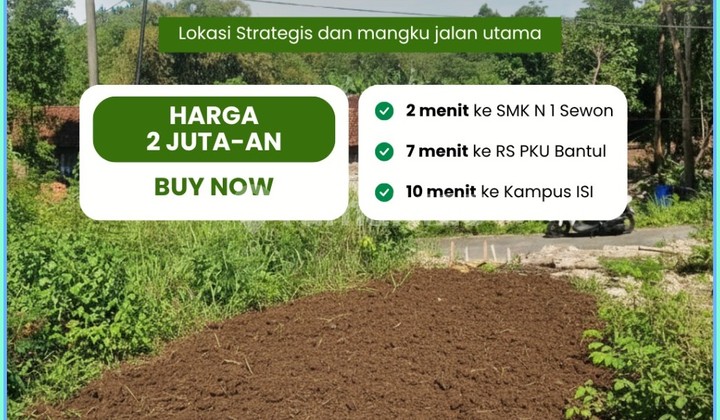 DIJUAL KAVLING SHM YOGYAKARTA MURAH JL BANTUL DEKAT KAMPUS ISI Tanah Murah SHM Dekat ISI Investasi Aman Lokasi Strategis di Sewon Bantul Bayangkan punya tanah di lokasi strategis yang nilainya terus naik setiap tahun Kini kesempatan emas terbuka untuk Anda! Dijual tanah kavling murah berlokasi di Jl. Bantul KM 7, Sewon - Yogyakarta. Lokasinya sangat potensial untuk hunian pribadi maupun investasi jangka panjang. Akses jalan lingkungan lebar 5 meter. Legalitas SHM Pekarangan, aman, dan bisa dicek langsung tidak perlu ragu! Spesifikasi: Luas tanah: 122 - 157 m² Lebar depan: 8 - 11 meter Jalan lingkungan: lebar 5 meter Legalitas SHM Pekarangan Lokasi Sekitar: 10 menit ke Kampus ISI Yogyakarta 7 menit ke RS PKU Bantul 7 menit ke Pasar Bantul 2 menit ke SMK N 1 Sewon Keunggulan: ✅ Lokasi strategis & ramai pemukiman ✅ Akses mobil mudah ✅ Legalitas aman & transparan ✅ Cocok untuk hunian atau investasi jangka panjang Jangan tunggu tahun depan saat harga sudah melonjak! Segera amankan kavling terbaiknya hari ini sebelum kehabisan!