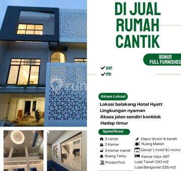 Dijual Rumah Cantik Bonus Full Furnished, Lokasi belakang Hotel Hyatt, Lingkungan nyaman Akses jalan sendiri konblok Hadap Timur 3 Lantai 3 Kamar & 3 Kamar mandi Ruang tamu Private pool Dapur bersih & Kotor Ruang makan Garasi 1,7 M