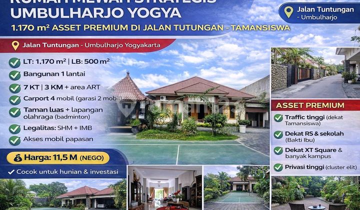 Bukan sekadar rumah, ini ASSET RARE ITEM di jantung Kota Yogyakarta. Berlokasi di Jalan Tuntungan, Umbulharjo (area Tamansiswa) - kawasan mapan, padat fasilitas, dan nilai tanah naik konsisten. Properti 1 lantai dengan tanah sangat luas ±1.170 m², cocok untuk hunian elite, land banking, maupun pengembangan investasi skala besar. Keunggulan utama aset: Mid-city prime location (Umbulharjo - Tamansiswa) Luas tanah 1.170 m² (sangat jarang di kota) Bangunan existing ±500 m² -> langsung pakai / hasilkan ️ 7 KT + area ART -> fleksibel untuk berbagai konsep Carport 4 mobil + garasi 2 mobil Taman luas + lapangan bulutangkis & ring basket Legalitas SHM + IMB (aman & bankable) Nilai investasi yang kuat: Dekat RS Bakti Ibu & RS Hidayatullah Dekat XT Square, Tamansiswa & banyak kampus Akses mobil papasan -> likuiditas tinggi Cocok untuk: Private residence kelas atas Klinik / guest house / homestay premium Townhouse / redevelopment project Parkir dana jangka menengah-panjang Harga: 11,5 M (NEGO SERIUS) ➡️ Rasional untuk tanah luas di tengah kota ➡️ Cocok untuk investor yang cari keamanan aset + capital gain besar