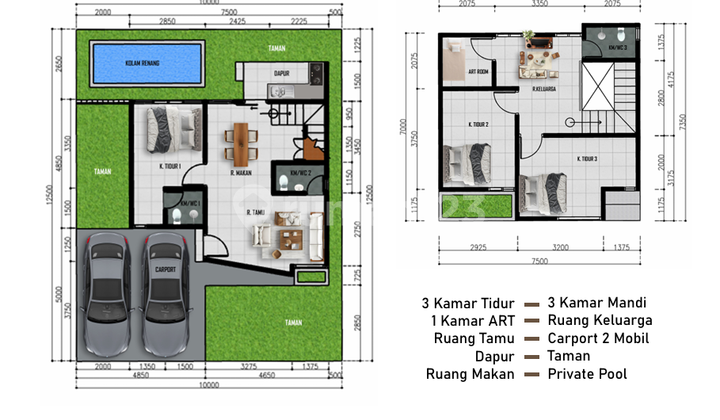 Ukuran : 9m x 20m Luas Tanah : 180 m2 Luas Bangunan : 151 m2 2 Lantai 3 Kamar Tidur 2 Kamar Mandi 1 Carport 1 Garas Sertifikat Hak Milik Listrik : ...